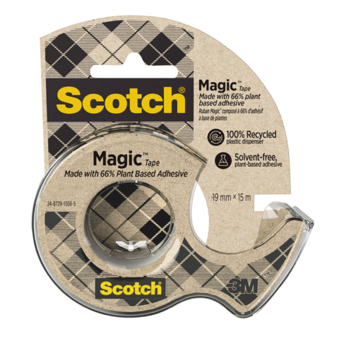 Das Klebeband MagicGreen: Grüner als je zuvor! Das Trägermaterial des Scotch® Magic "A greener choice" Klebebandes besteht aus Naturfasern und der Klebstoff ist lösungsmittelfrei und wasserbasiert. Die Verpackung und der Rollenkern bestehen aus 100% Recyclingkarton. Das hochwertige Klebeband für den Bürobereich hat die bewährte Scotch® Magic Qualität: Es ist auf Papier unsichtbar, beschriftbar, schattenfrei kopierbar und alterungsbeständig. Der Abroller besteht aus 100% recycelten Kunststoff.